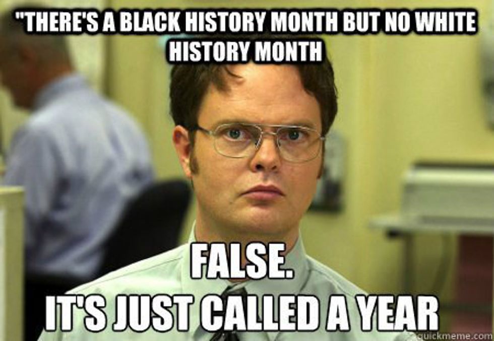 She essentially believes that since there is no “White History Month” then there should be no Black History Month. I was unsure how to combat this statement at first, or rather, of the many ways there were to combat it, which was the most efficient. In the end, I decided that there were three main flaws with this line of argumentation.