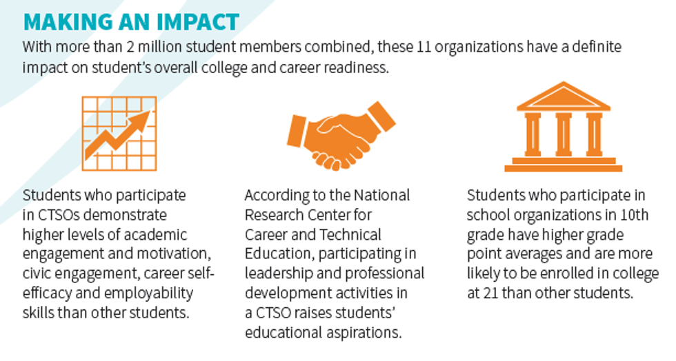 How can being in a CTSO benefit a student? Career and Technical education in the field that the organization deals with a new skill set, potential for competition at regional, state and national levels, opportunity to develop relationships with peers and much more. The graphic below expresses more of the benefits of joining these organizations and can be found on the CTSO website.