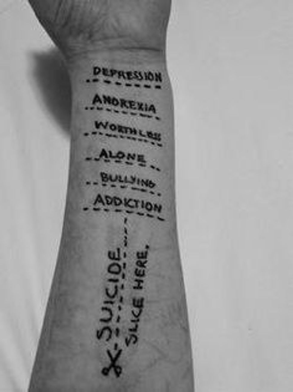 These images depict and glorify self-harm, Anorexia Nervosa, depression, suicide, and Body Dysmorphic Disorder. These images can be found on Pinterest, Tumblr, Twitter, and Facebook. Sharing pictures like these sends a strong message to young social media inhabitants: there is beauty in being broken, there is beauty in suffering. It discourages the seeking of help and encourages the hiding of their struggles. Being shared along with these pictures is the idea that nobody cares or understands, therefore help doesn't exist and it is, in turn, better just to suffer in silence. These types of posts can project feelings like insecurity, depression, uselessness, suicidal thoughts and being unlovable on the youth who scroll through social media; this can be detrimental to their mental health and, in turn, their physical health.