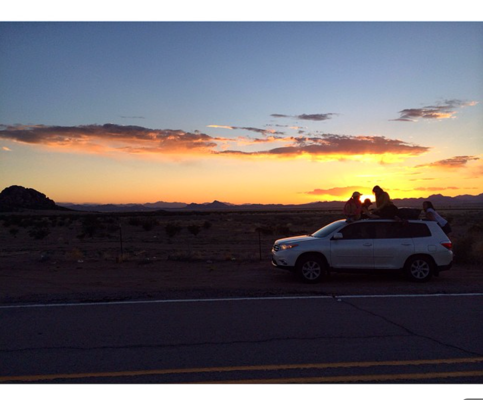 As we headed out on the 12-plus hour road trip we may have gotten lost in El Paso, seen Mexico from the highway, and made several stops trying to fix "Howard." Now, Howard became the beloved name of our soft car-topper that held the majority of our luggage on top of Abbey's Toyota Highlander. As soon as the tires hit the highway "Howard's" straps, tying down everything, made the most annoying noise flapping against the car. And so naturally we made several attempts to silence Howard. Finally at one point we had a water bottle and paper towels stuffed underneath to silence the racket. We get creative points for that right?