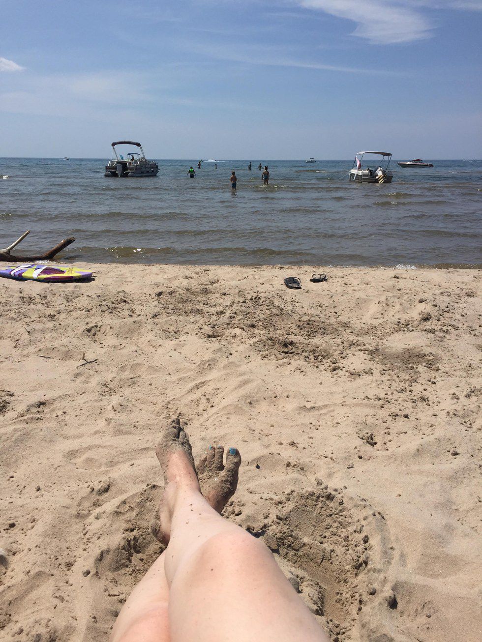 Every day (that it's not raining), we go to what we call the "boat beach." We ride our boat across the pond to a large strip of land (the boat beach), and we walk over to sit in our beach chairs and swim in the lake (which is Lake Ontario). The beach is my happy place. I could go there at 10 a.m. and stay until 9 p.m., without being bored or asking to leave. There is truly nothing better than that beach.