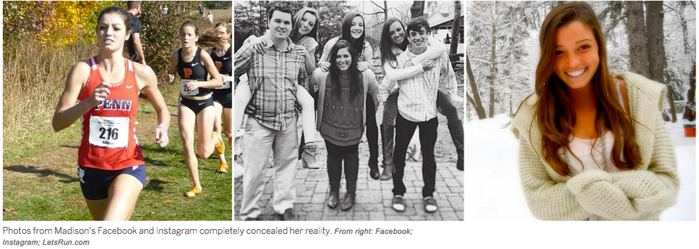 In January of 2014, a student at the University of Pennsylvania took her own life. Her name was Madison Holleran. She was a track star, in addition to being smart, beautiful and talented. Her suicide was a mystery to everyone who knew her, from her own parents and siblings to her friends and classmates. Looking at her social media accounts would not tell the story behind the pictures and the status updates. She was depressed. Still, she posted pictures of herself doing what she loved—running—and pictures of herself with her family and friends, smiling. Nobody knew what was truly happening to her, and nobody knew what was about to take place.