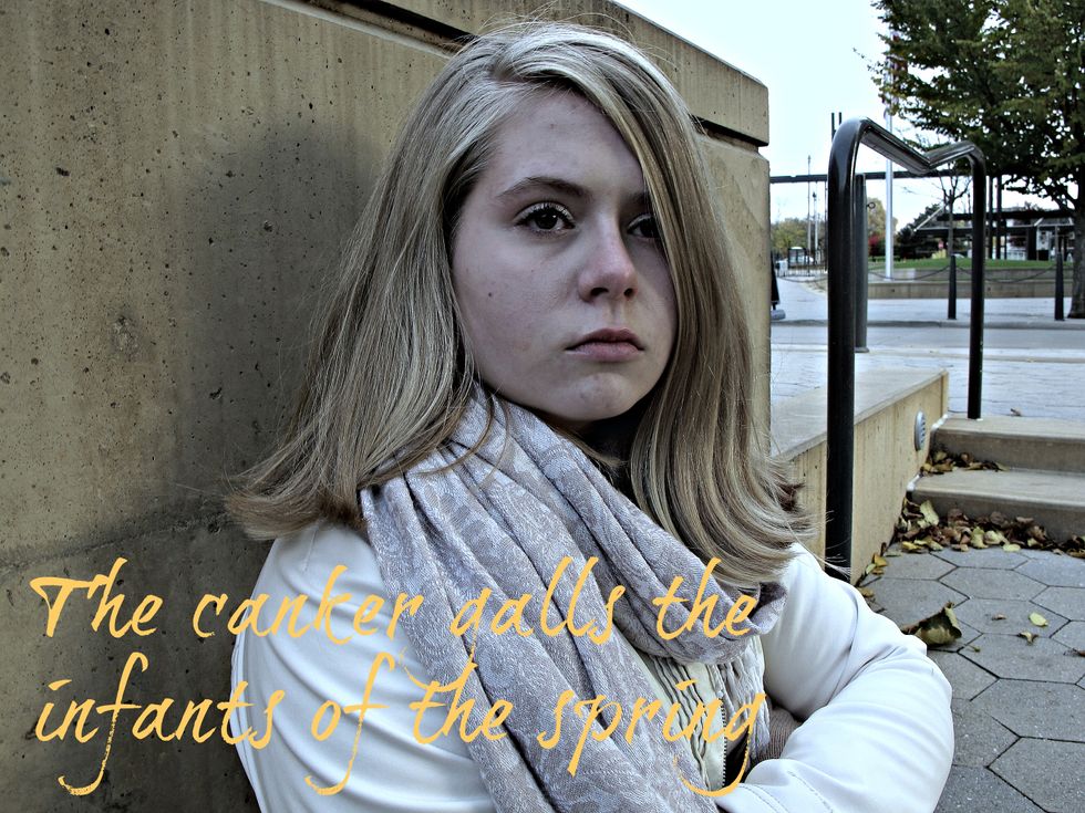 The lines I chose in particular were from a scene where the character Laertes is speaking to his younger sister Ophelia, and telling her to beware of Hamlet and any other man that tries to win her heart, for she is only safe in fear rather than standing up for herself.