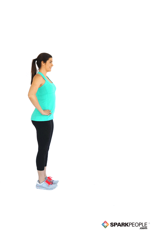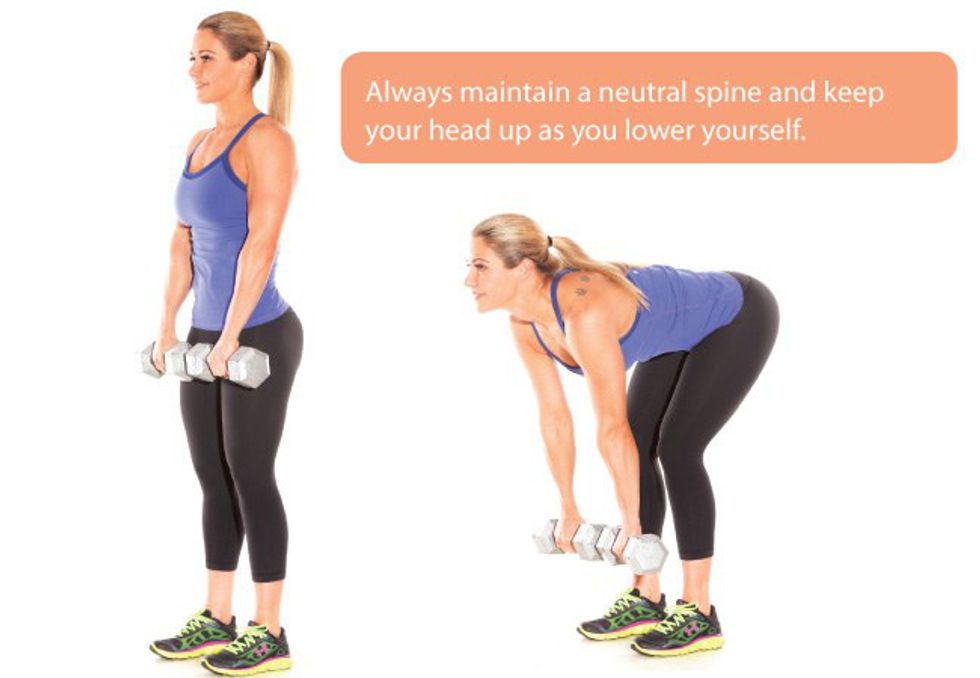 Keep your feet shoulder-width apart at a comfortable distance, and your dumbbells (or milk jugs) on your thighs slightly in front of you. Slightly bend your knees for balance, and lean forward slightly. While maintaining a straight back, lower the weights to about halfway down your shins, and then slowly move back to the starting position. Sometimes keeping tension in your glutes helps maintain form.6. Chair Dips, 20 reps.