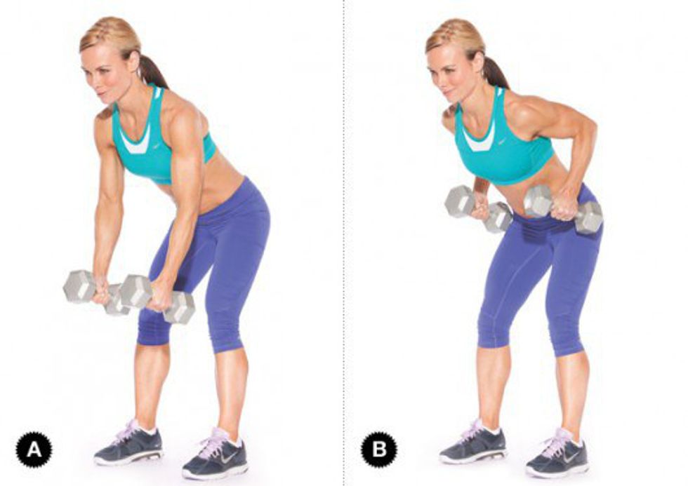 Standing straight with your feet roughly shoulder-width apart at a comfortable distance, hold your dumbbells (or milk jugs) in front of your thighs. Slightly bend your knees and lean your upper body forward until your body forms 45 degrees. As if you were rowing a boat, pull the weights straight up towards your chest. Hold this position for a moment before lowering the weight in reverse fashion. Keep your abdomen tight and clenched while performing this exercise for maximum effect and correct form.