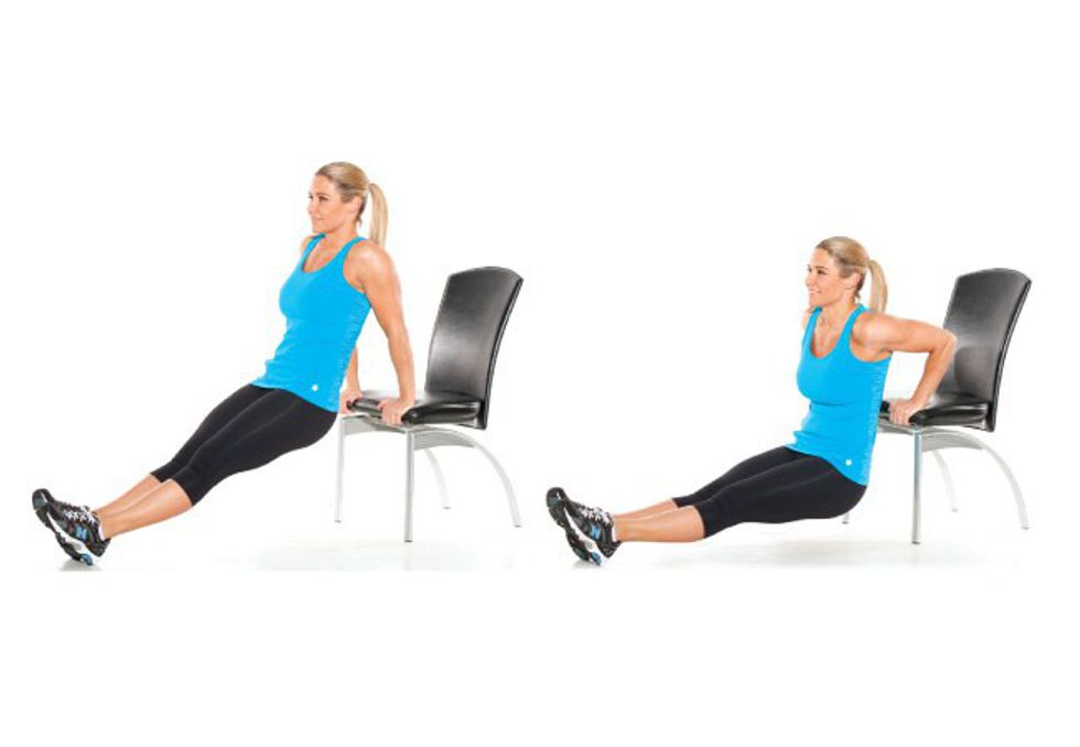 Using a sturdy chair (emphasis on the sturdy), place the palms of your hand on the edge of the chair behind you. Straighten your arms so that they are supporting your weight, and extend your legs out in front of you so that the heels of your feet are on the floor. Using your arms, lower your body until your arms form 90 degrees, and then push back upwards until your arms are straightened to resume the starting position.