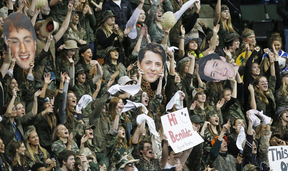 Edina High School has a great student section. Yes, they have some negative chants, but really every school does. From camo to "preppy" to tropical, EHS goes all out for themed student sections and they've got some great spirit. But you know every person in the Xcel Energy Center (not from Edina) probably hates you at the time. You might even remember the chants "F*ck Edina" that echoed around. But we always kept a smile on our faces, supporting our team.
