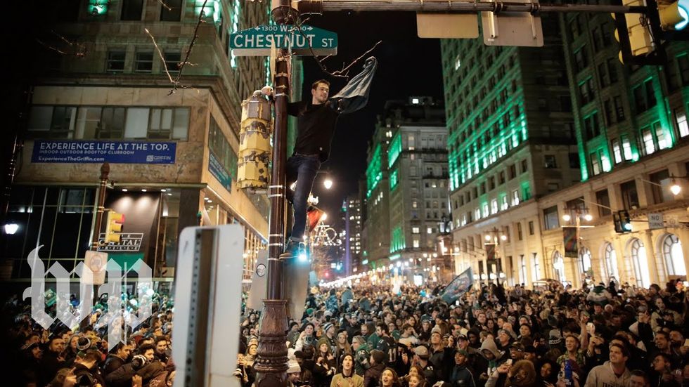 Everyone was happy and going crazy and chanting for the Eagles. There were fireworks and sparklers and Roman candles and streamers, some of which were toilet paper streamers coming from the high up windows. Did you hear about the Ritz Carlton Awning falling? I watched that. Light posts were coming down and if they weren't falling, there was sure as hell an Eagles fan or two at the top.