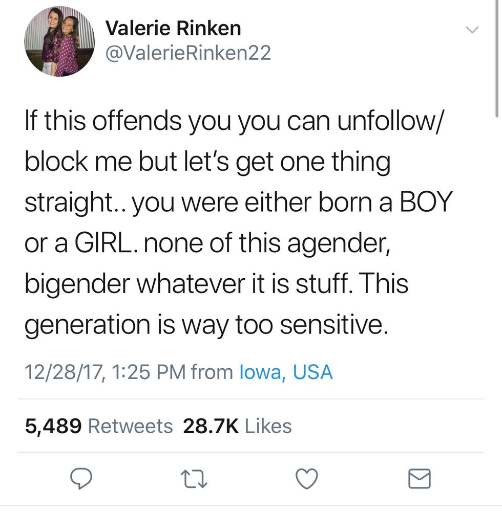There was a tweet that recently caught my attention – it was posted by a woman who attends the University of Northern Iowa (which is only about an hour and a half from Iowa State) and got almost 30k likes. It reads: "If this offends you, you can unfollow/block me but let's get one thing straight.. you were either born a BOY or a GIRL. none of this agender, bigender stuff. This generation is way too sensitive."
