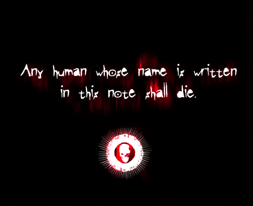 This anime begins with a scene from what is known as the Shinigami realm, a barren, gray landscape. Shinigamis are creatures that each possess a Death Note, which is a book that can take the lives of humans. Shinigamis use their Death Notes to kill humans, which then adds the remaining years of that human's life to the Shinigami. A Shinigami by the name of Ryuk becomes bored, so he drops a Death Note into the human world and waits for someone to find and use it. Light Yagami is a popular, high school genius, who, when gazing outside his classroom window, sees the Death Note fall from the sky and land in the courtyard. He collects the notebook after class and takes it home. Upon opening it, he discovers that there are a set of instructions, one of which is shown in the gif above. After an internal battle, Light decides to test the notebook out, eventually discovers that it is, in fact, genuine. The Shinigami, Ryuk, appears to Light, stating that he will be following Light around, so long as Light is still the notebook's owner. Light then decides that he has the power to pass judgement on people, killing those who do wrong, so that Light can become the "god of the new world." The spike in deaths leads the government and a world-famous detective to get involved, so that they can catch the killer. Ironically, the police chief in charge of the investigation is Light's father.