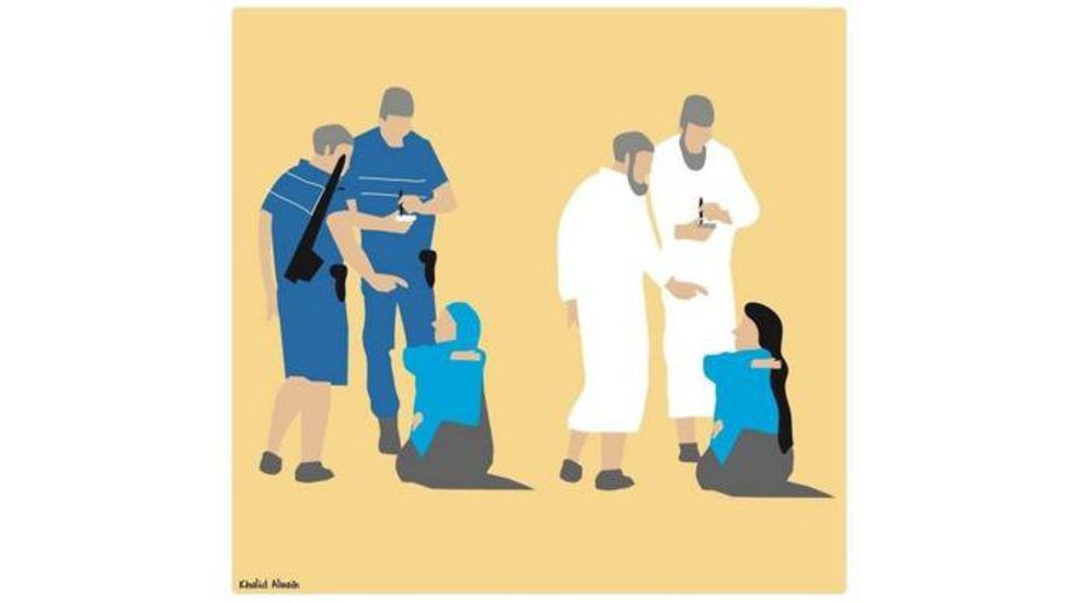 The caption of this piece by Khalid Albaih, an artist in Qatari, is "In the name of freedom, while others in the name of religion."
