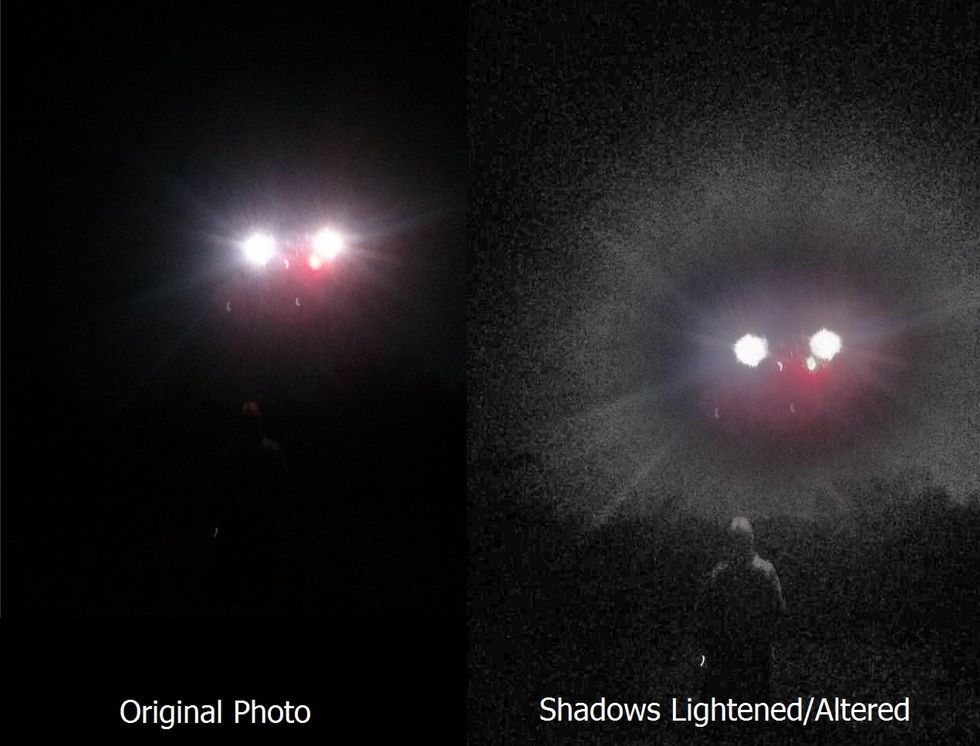 This sighting was reported anonymously online first in a Reddit thread. A man who chooses to remain anonymous (sans username of course) awoke to find a mysterious photo on his phone of the previous night. He states that all he remembers is going to bed and waking up the next morning. The photo details say it was taken at 22:51:22 on May 26th 2014. Various theories about the photo have been thrown around, but none can account for the colored lights, treeline background, and mysterious figure in the photo. It remains mystery to this day.