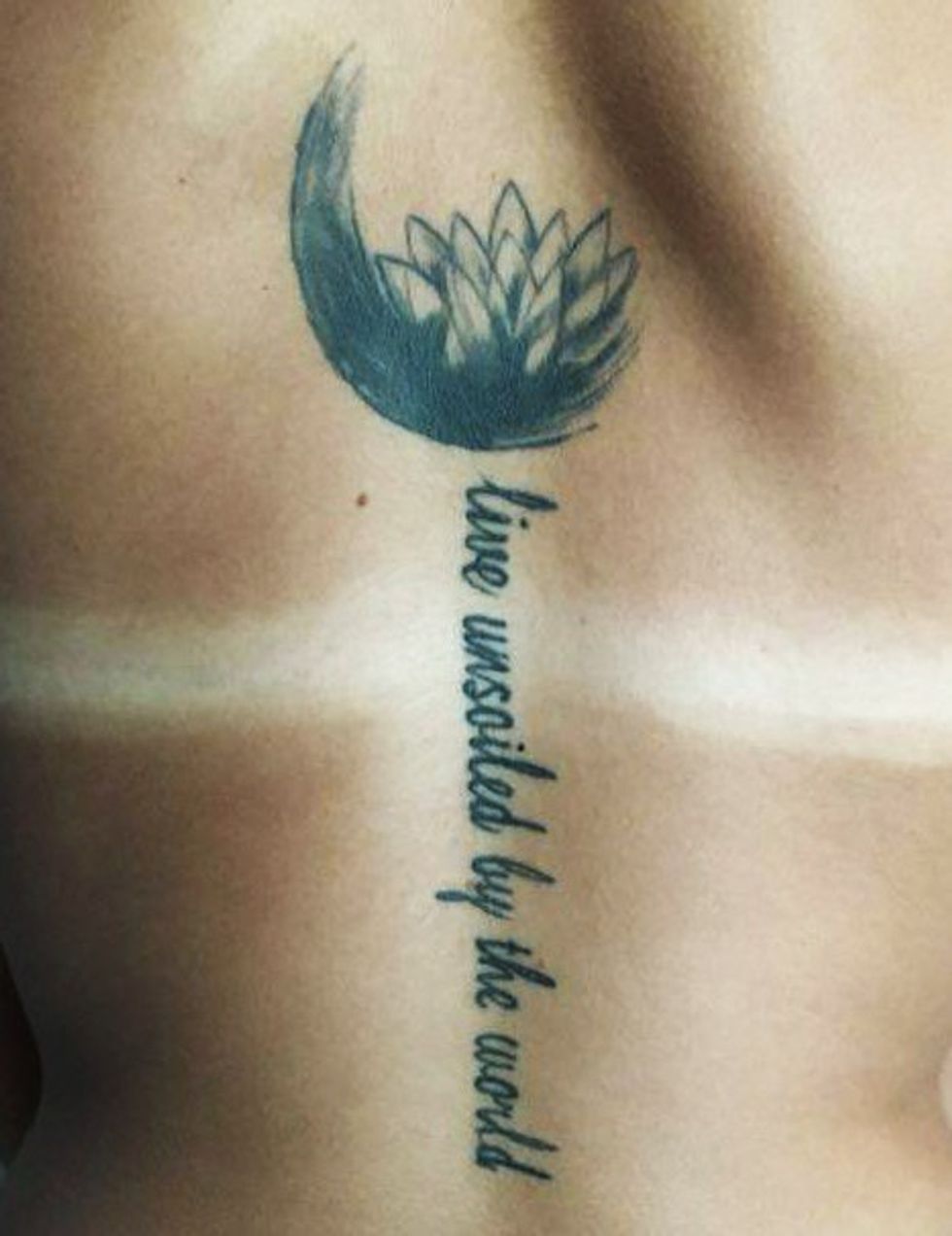 “My tattoo is a lotus flower with a Japanese enso around it. The enso is a symbol of strength and elegance and the lotus flower represents the beauty of it as it arises from the muddy waters, untouched and [un]damaged from the mud around it. The words say "live unsoiled by the world" -- it is part of a Buddha quote that expresses how we should all live like the lotus flower, that no matter what we come across in life we should not let it affect or change the beauty we have inside and out. I designed this [tattoo] myself as a reminder to go through life with strength and elegance, and untainted by whatever I may go through.”