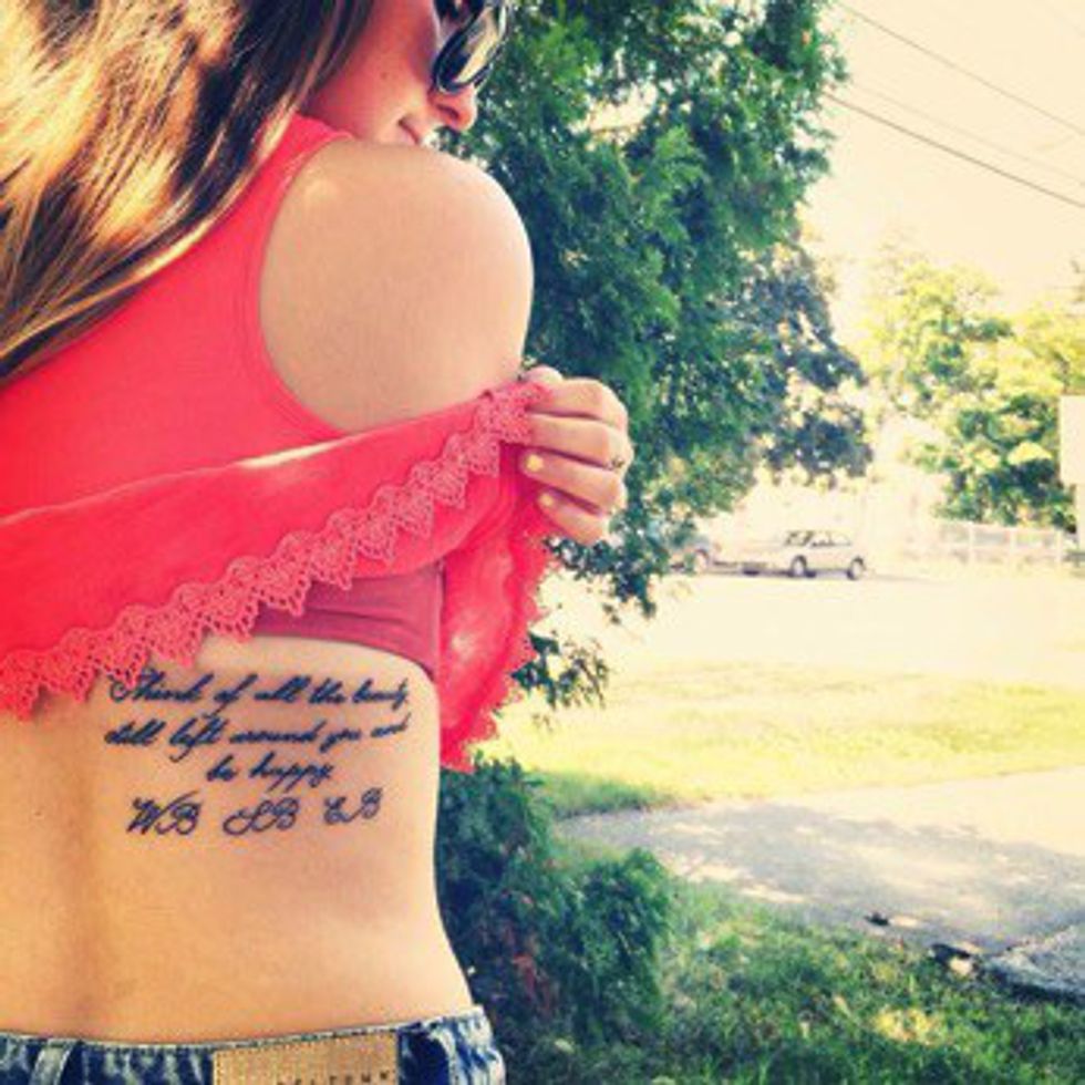 “Two years ago I woke up and made one of the most permanent changes to my body––I hadn’t planned it, I didn’t tell my parents and I went to the first parlor that would take me that day. This decision took all of my money, set my back on fire and was simultaneously a form of therapy I never knew existed. Two years ago I broke up with the “love of my life.” After I realized this love had turned to comfort, and lust turned to confusion, I made what I thought would be the most devastating decision of my life––looking back now, it wasn’t. Although I may not have fully planned my first tattoo, or consulted my bank account, this extremely permanent fixture on my body showed me that I could emotionally, mentally and even physically make changes in my life––and be totally okay in the end. Two years have passed since I got my first unplanned, poorly financed tattoo and I have absolutely no regrets about my decision––I accepted the events that were surrounding me at such a transitional time in my 20-year-old life. That day, I decided to make, embrace and not run from change, I decided to “think of all the beauty still left around you and be happy.”