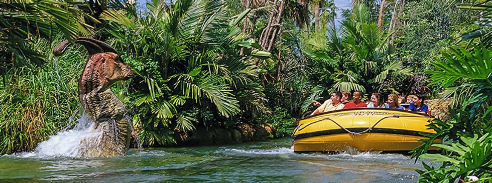 Based on Steven Spielburg's film "Jurassic Park," the Jurassic Park River Adventure takes you to a place where dinosaurs are huge and everywhere. The ride takes you through Ultasaur Lagoon, Stegosaur Springs and Hadrosaur Cove. As you float through the water, there's a big surprise (and splash) at the end of the ride! It's better to wear clothes you don't mind getting wet (sometimes the car you sit in is still pretty wet.) The wait time can be kind of long -- the longest I've seen is 60 minutes -- but the line usually moves along fairly fast once you're there!