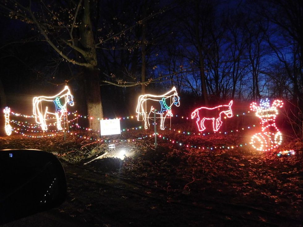 Another place that has a great light display is the Woodland lights display! They not only have a half mile wooded trail of lights but there are also amusement parks such as a slide for kids, a small roller coaster, and there's a ferris wheel that you can ride that's lit up! There's also live animals such as deer!