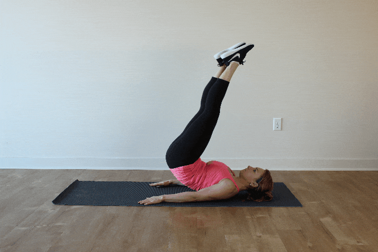 While you're down there: put your feet straight up in the air, with a slight bend in the knee if you need. Reach your hands up as far as you can to your toes. Again, be sure not to strain the neck. Do it 20 times, 30 being the eventual goal.