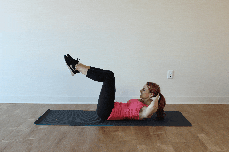 Keep it simple to start: put your hands behind your head to support the weight, but make sure not to pull your head forward and strain your neck. Focus on your core and lift your upper body high enough for the shoulder blades to leave the floor. You can put your legs at table-top for an additional challenge, or keep your feet on the floor. Breathe out as you lift and in as you go down. Do at least 20. 30 is the ideal number of repetitions you will eventually hit. If you can hit it now, do it.