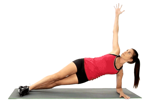 Take a quick break and turn on your side to hit those obliques. Go onto your forearm and push upwards to hold yourself in a stable position. Hold your core tight and lift the arm on your upper side straight up in the air. Hold for 30 seconds, take a short break and switch sides. As you do this more and more, progress to 45 seconds.