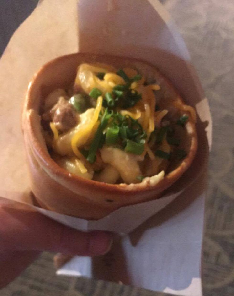 Speaking of variations on macaroni and cheese, this dish is certainly a specialty that's unique to Epcot! The term "handwich" is used to describe the cone (made out of bread) in which the macaroni and cheese is stuffed into. This dish actually has a bit of (strange) Disney history to it, as the kiosk was located in a building that featured an exhibit for Epcot's upcoming 35th anniversary. The handwich was introduced in the early days of Epcot and was dubbed as "food of the future" for being an ideal food for multitasking. But the dish, which was served at the Land pavilion with filler options beyond macaroni and cheese, soon found itself being removed from the menu and has only been brought back every once in a while as a "limited-time offering." As I ate this piece of Disney history, I enjoyed the creaminess of the cheese and how it paired deliciously well with the ground beef, onions and peppers.