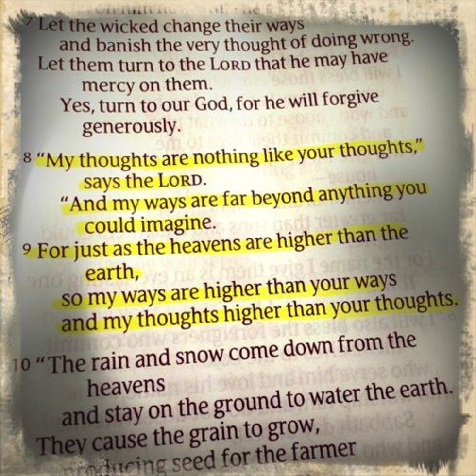 7. "For my thoughts are not your thoughts, neither are your ways my ways, declares the Lord. As the Heavens are higher than the earth, so are my ways higher than your ways and my thoughts higher than your thoughts." (Isaiah 55:8-9)