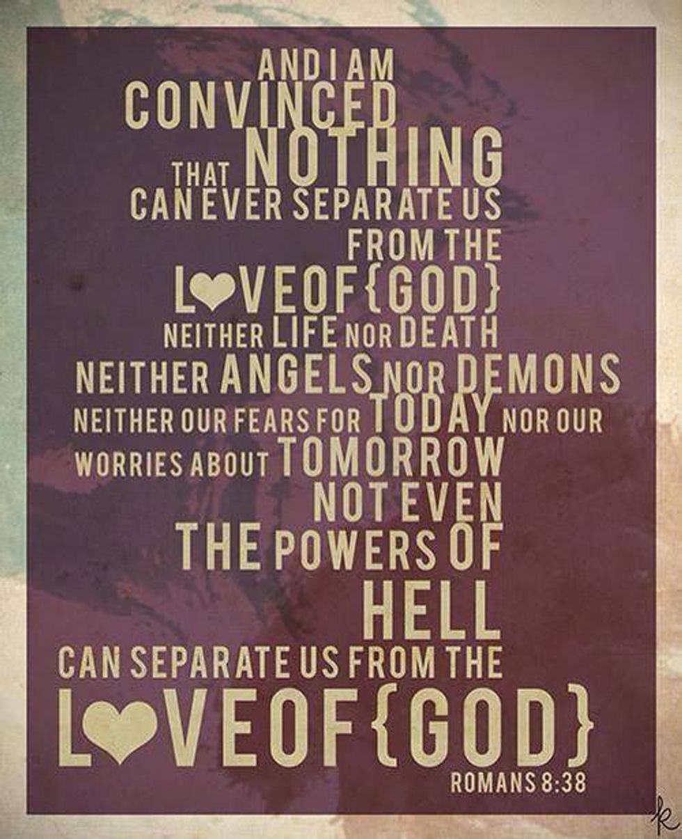 6. "And I am convinced that nothing can ever separate us from God's love. Neither death nor life, neither angels nor demons, neither our fears for today nor our worries about tomorrow--not even the powers of hell can separate us from God's love". - Romans 8:38