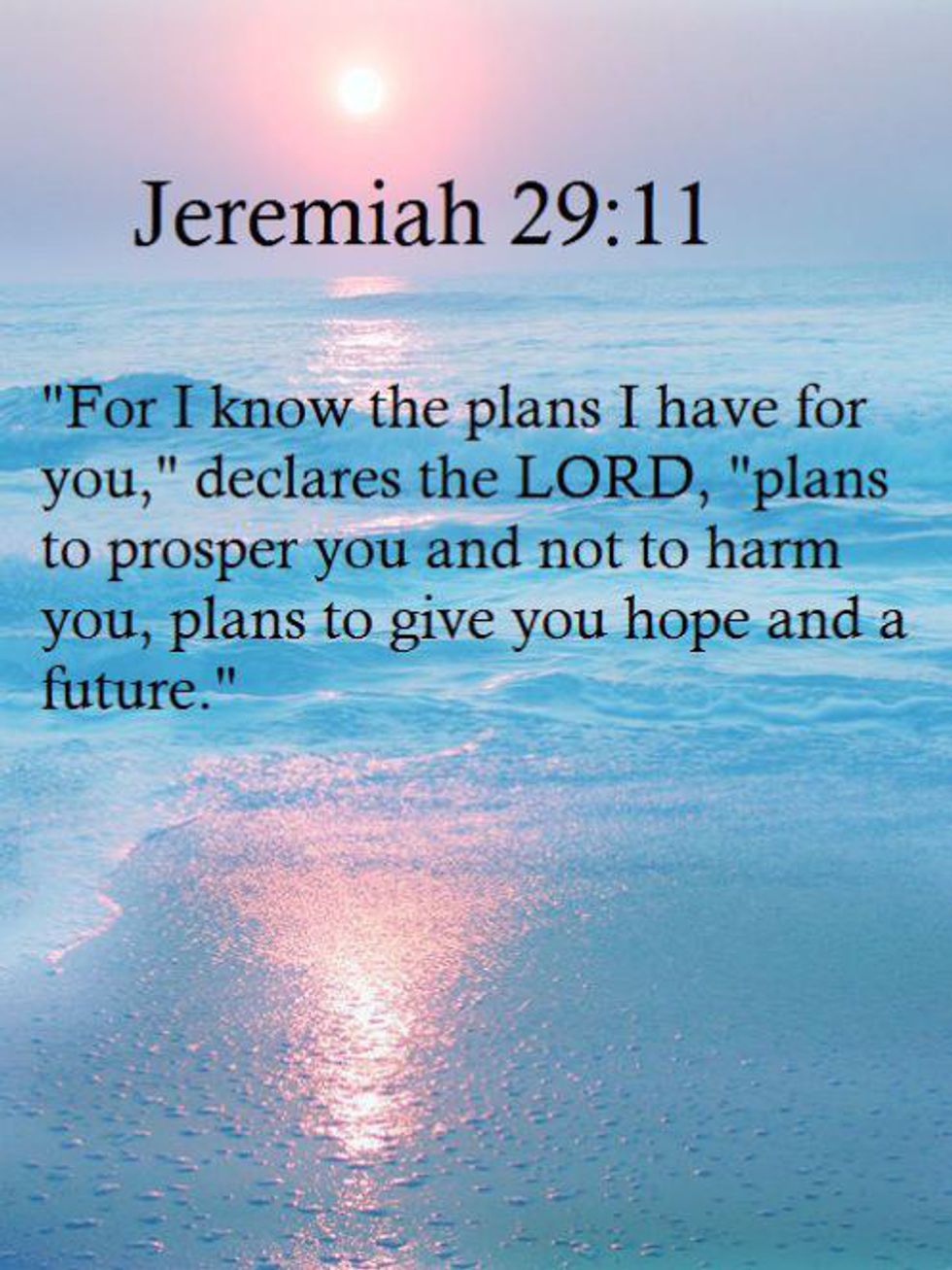 10. "For I know the plans I have for you declares the Lord, plans to prosper you and not to harm you, plans to give you hope and a future". -Jeremiah 29:11