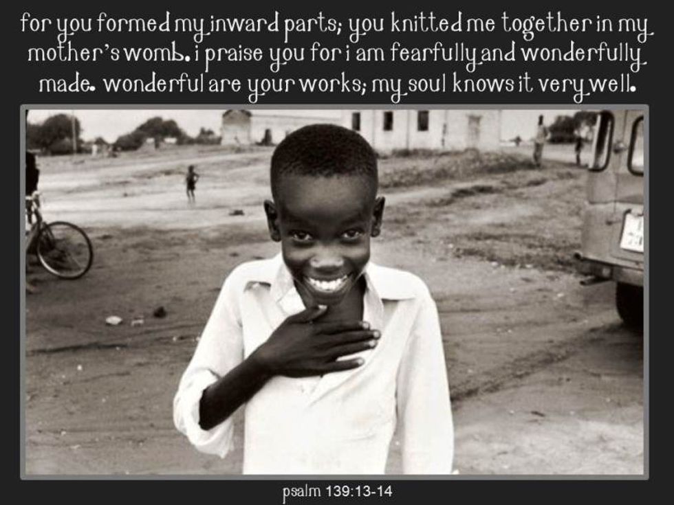 “For you created my inmost being; you knit me together in my mother’s womb. I praise you because I am fearfully and wonderfully made; your works are wonderful, I know that full well.”