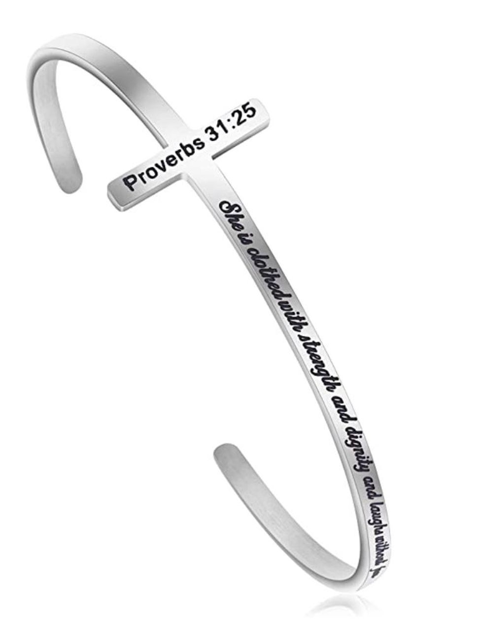 The Cross Bangle is simply elegant and includes a beautiful cursive font of Proverbs 31:25, which says, “She is clothed with strength and dignity and laughs without fear of the future.” There are also a few other verse choices when looking at this bangle.
