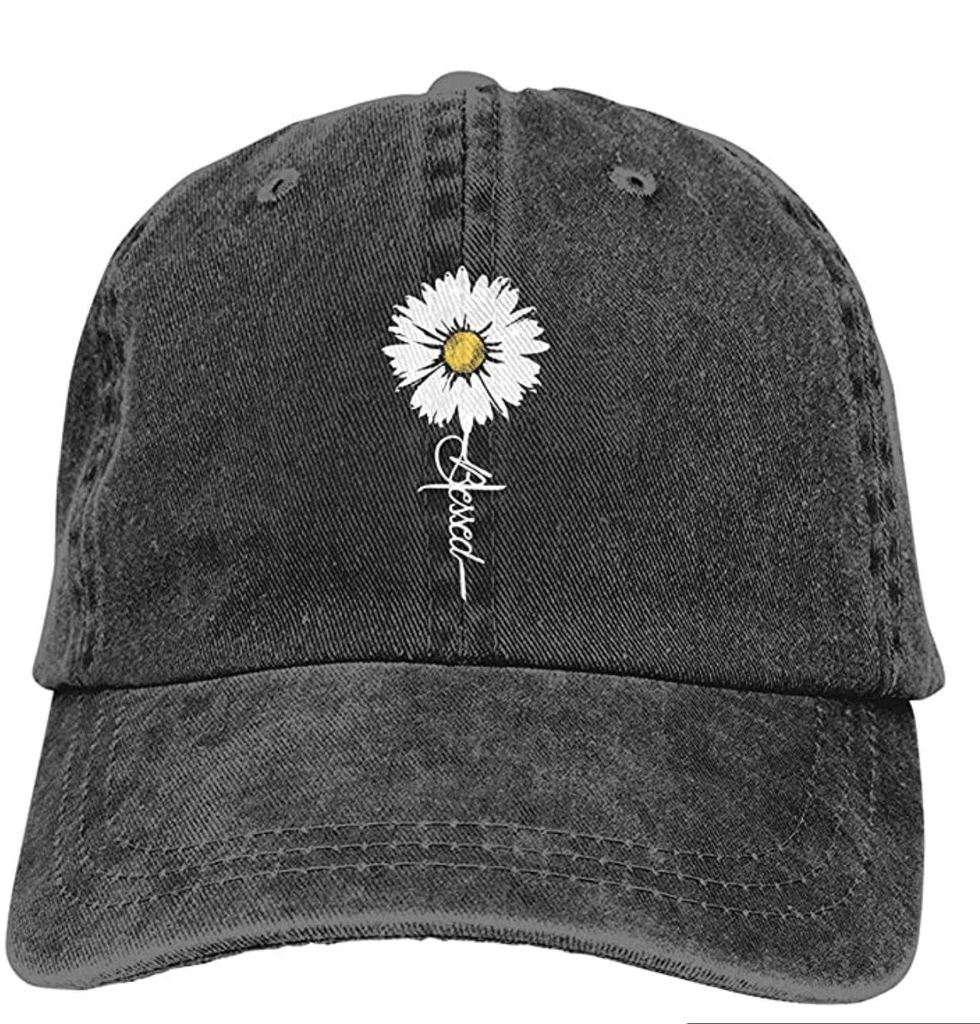 This baseball cap has distressed-vintage look and white font that turns into a sunflower. The baseball cap has such a cute style to it and will be probably be worn out by next Christmas.