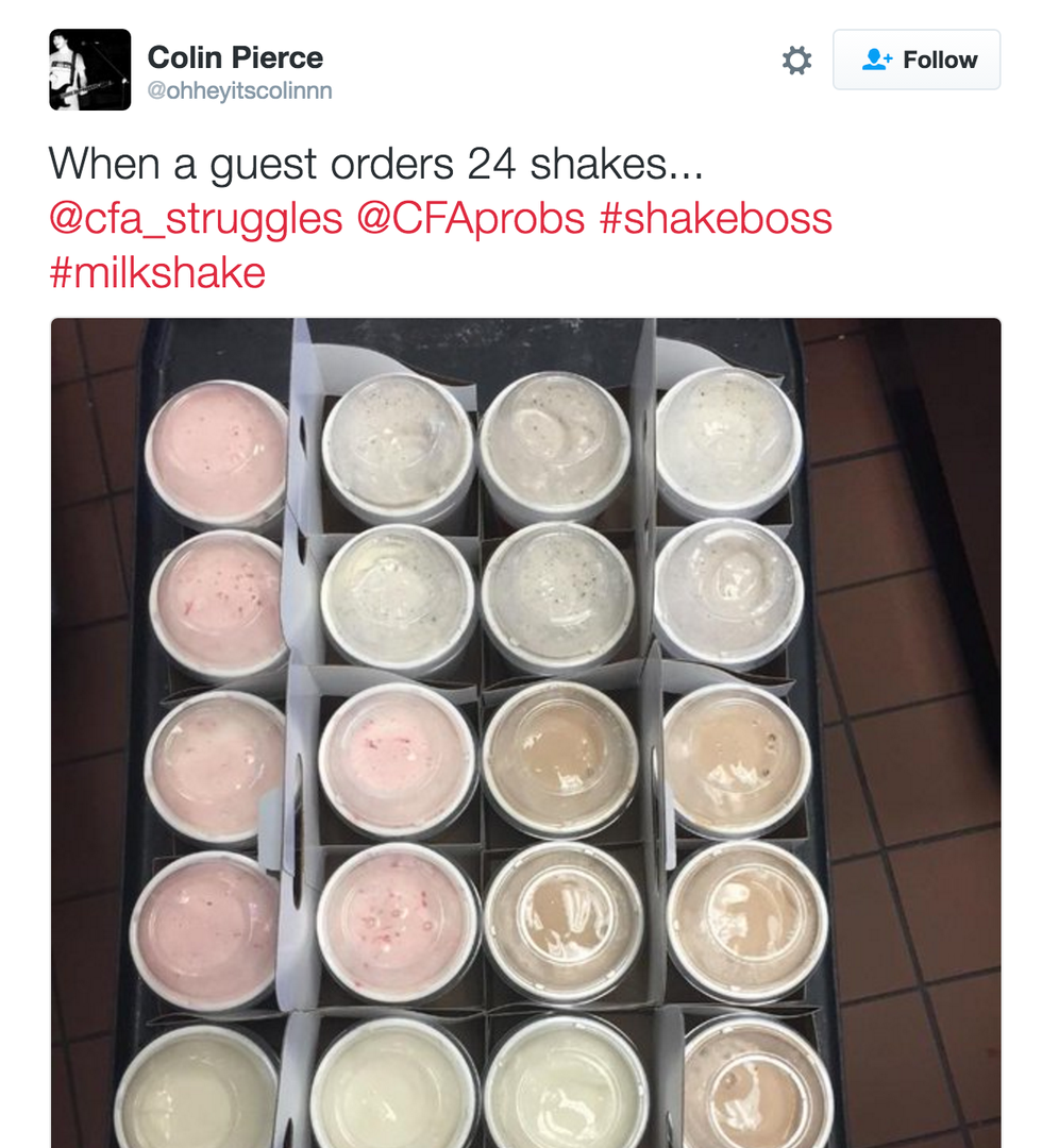Especially when you already had a full drive thru line because the person that makes shakes is also taking all the orders from the cars in drive. They are called “hand spun milkshakes” for a reason, they're made by hand one-by-one. So please don’t complain when your shakes take longer than five minutes to come out. I only have two hands and I'm trying my best.