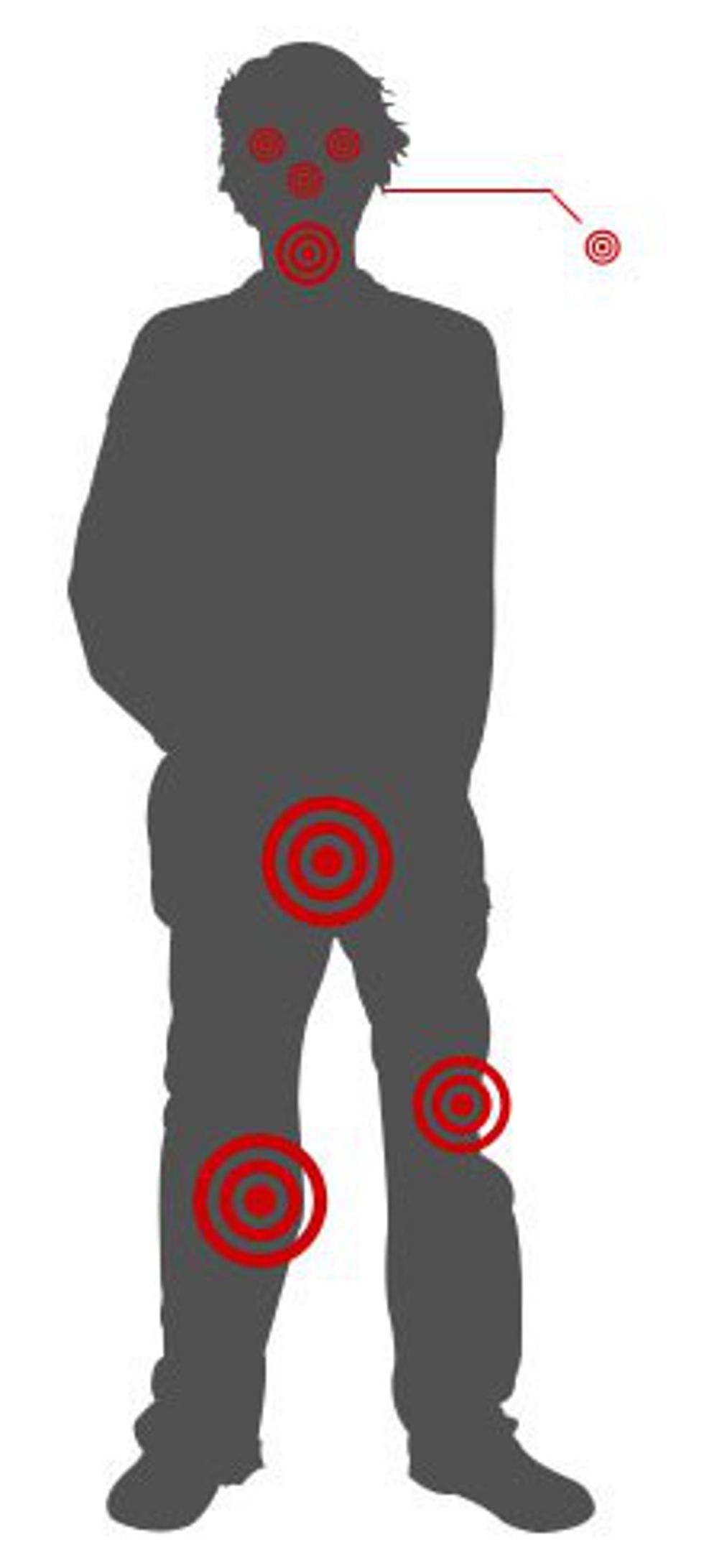 Areas to aim for when defending yourself are the temples, eyes, ears, nose, throat, solar plexus, and the groin. All of these areas, as you can imagine, can be extremely painful when hit correctly.