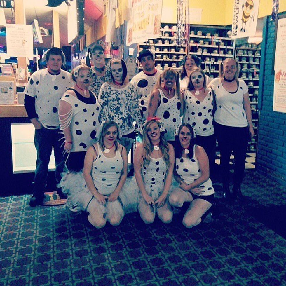 Can you imagine entering a room to a giant group of Dalmatians? It's priceless and unexpected. If someone wants to stand out in your group, they can be Cruella De Ville, just get colored hair spray and a black and white fur vest and white dress