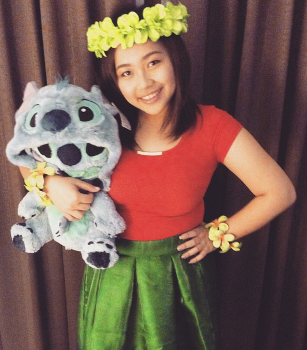 a red top, a hula skirt or green skirt and a flower headband, all super easy and affordable (stitch optional)