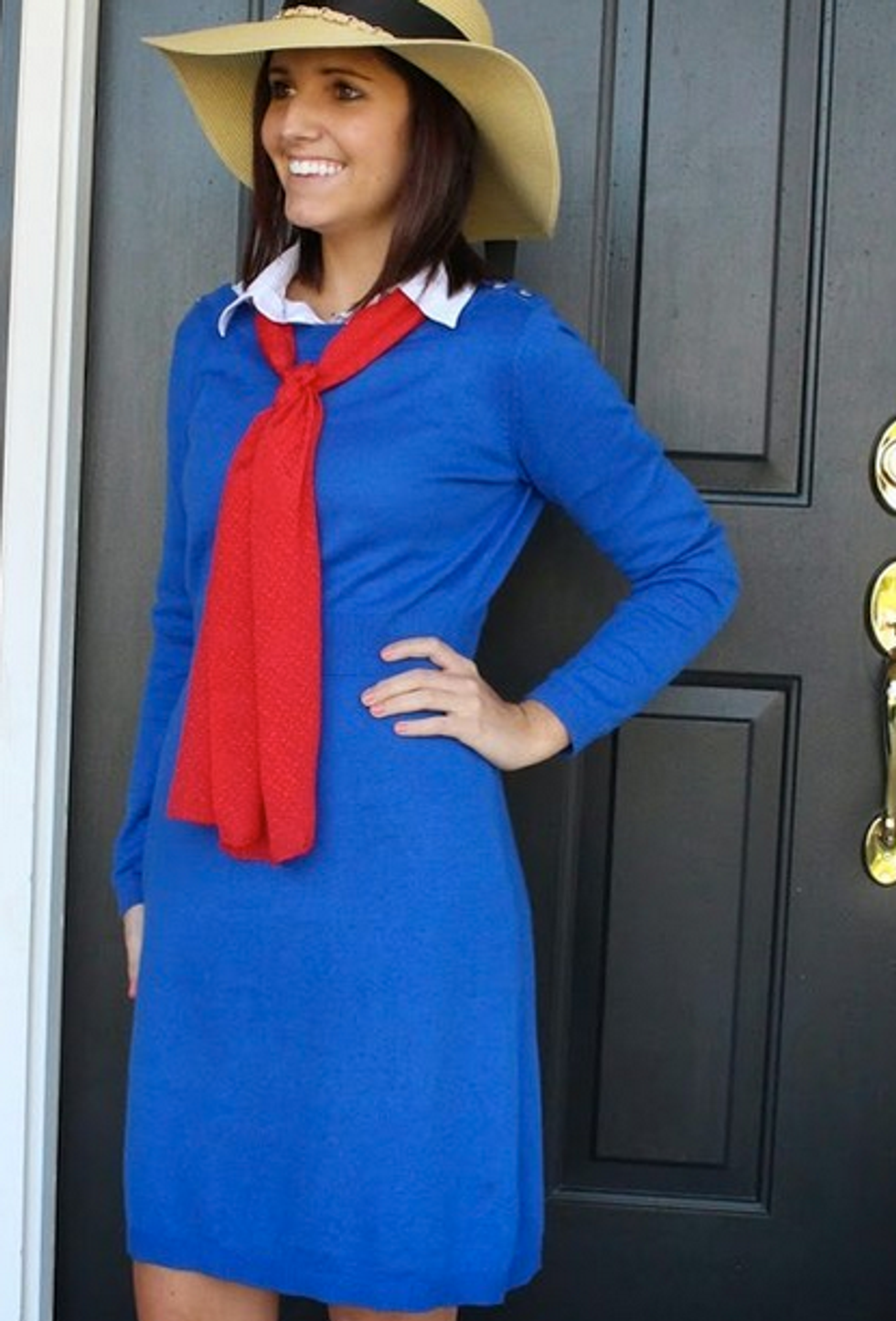 a straw hat, blue dress, red scarf, mary janes and white over the knee socks.