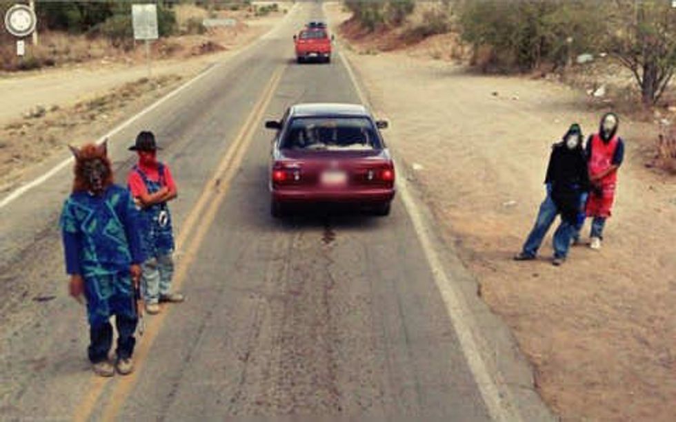 The worst thing about this is that there is no way to get the whole story. In fact, there is no way to get any of the story at all. Why are these people standing by the road wearing masks? Are they playing a joke, or is something seriously wrong about to happen? We will never know because all we get is this one still image, which looks like it came straight out of a horror movie. All I can say is I am happy I was not driving down that road at that time.