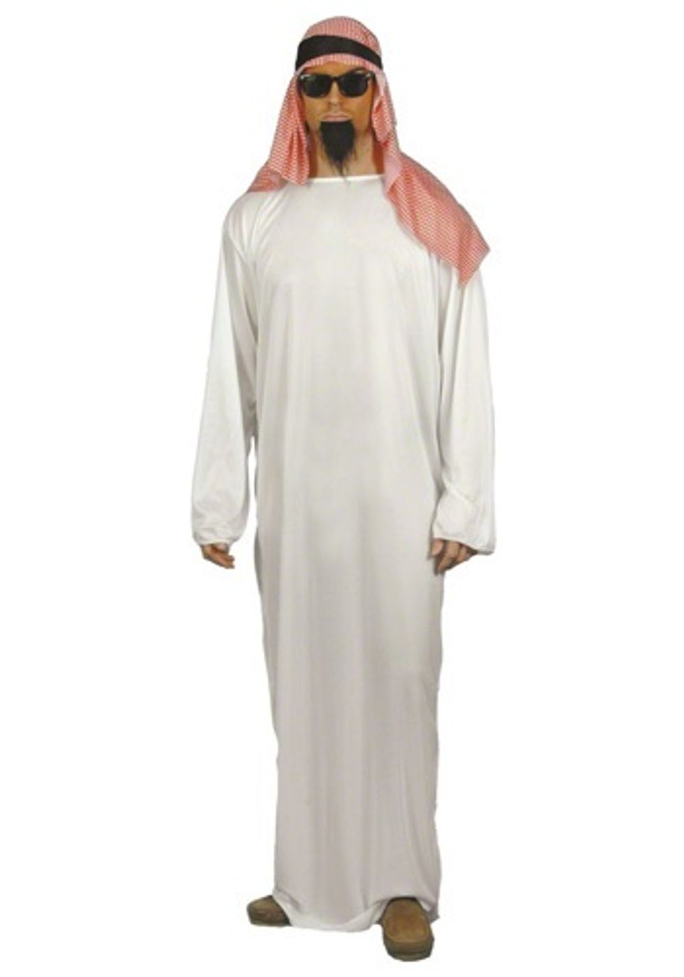 This "Arabian Sheikh" costume is extremely stereotypical. The fake goatee, thawab robe, and keffiyeh headdress inappropriately mock Middle Eastern culture.
