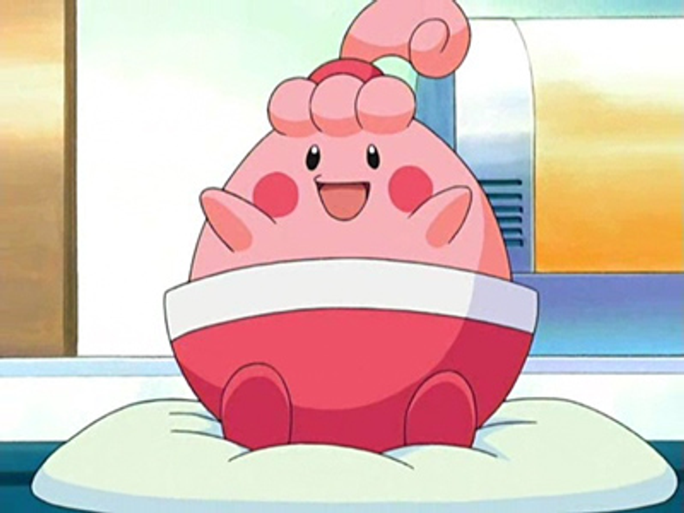 This is known as the "Playhouse Pokemon." Whoever does not want to play with this cute little egg-like creature is crazy. It's the baby-version of Chansey and it brings a smile to my face no matter what. It's a soft, pink, egg with what looks like a ponytail. Despite its tiny size, it has the ability to carry very heavy items around. This Pokemon definitely makes me happy.