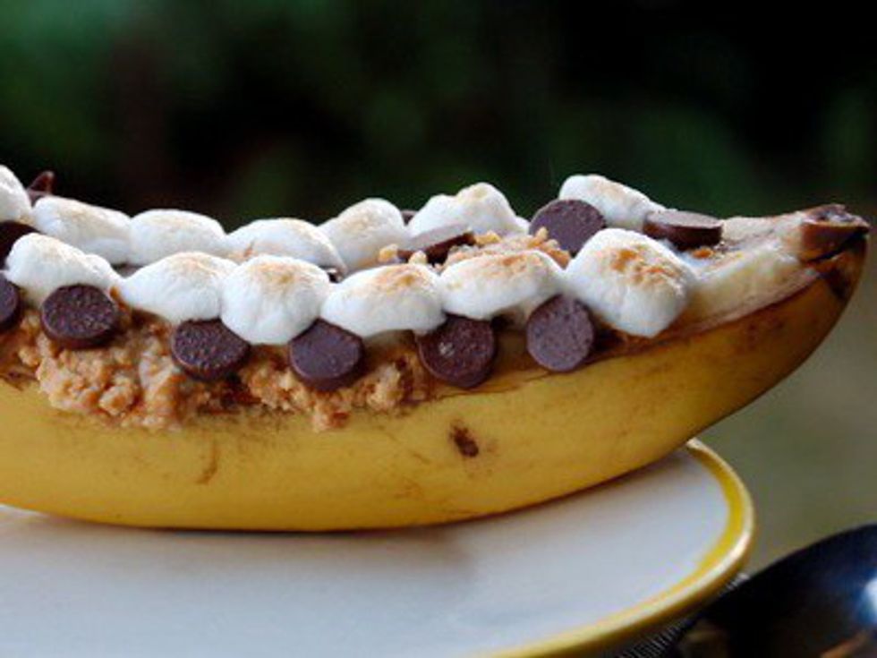 Ingredients: Four bananas, one-half cup of chocolate chips, one-half cup of miniature marshmallows, one-half cup of crushed graham crackers.