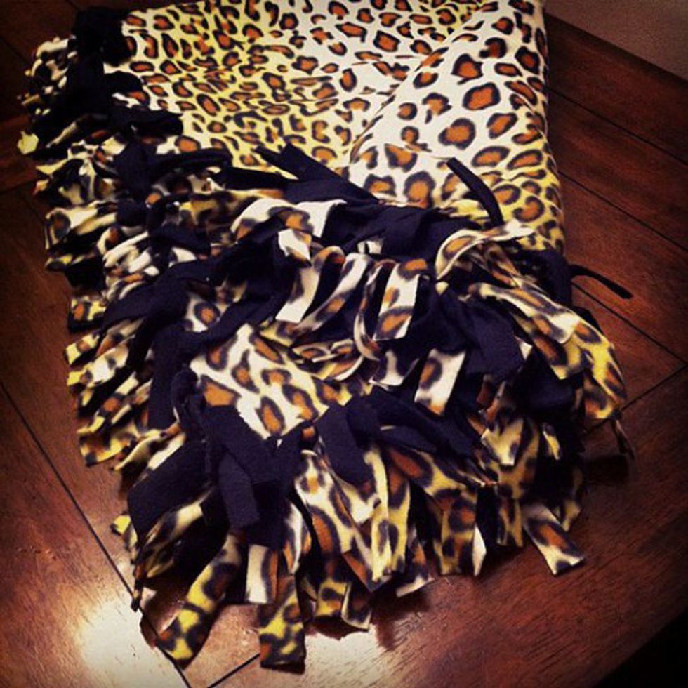 The easiest blanket you'll ever make in your life! This only requires two pieces of fleece, scissors, and our hands. You can buy fleece from a craft/fabric store such as JoAnn Fabric. Pick a patterned fabric and a solid fabric and buy 2 yards of each material (about $4.99 per yard.) Layer the two fabrics and cut about one and a half inch by two inch slits around the blanket and tie the upper and lower fabric pieces together, and you've got yourself a cozy blanket.