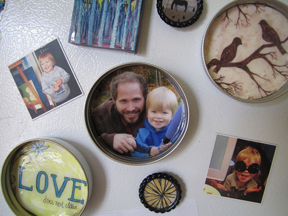 What better way to remind someone of how much you care about them than reminding them every time they open their fridge! Measure mason jar lid widths and cut out pictures and attach them to the lid. Glue a magnet to the back of the lid and put it on the fridge!
