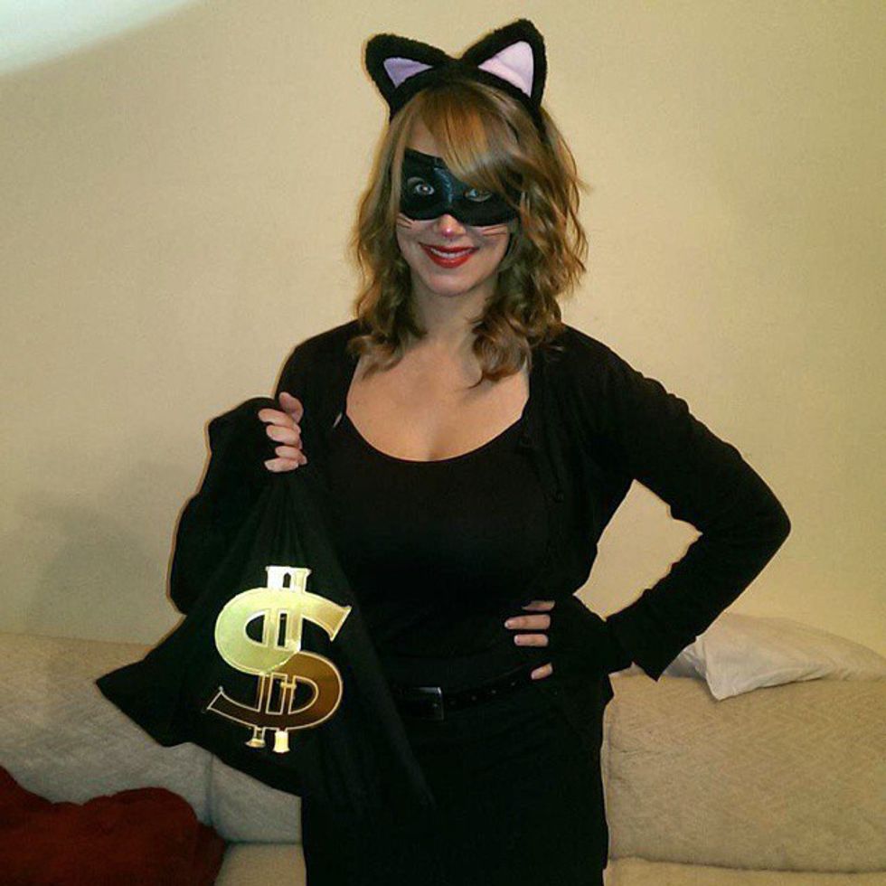 7. Cat Burglar - For those looking to dress up as a cat, here's a way to step up your game and make your costume stand out. In addition to the whiskers, cat ears and all black clothing, your costume should consist of a black eye mask and a black bag to hold all of you stolen goods. Of course the bag should have a golden dollar sign on the outside of it; what other way is there to display your thievery?