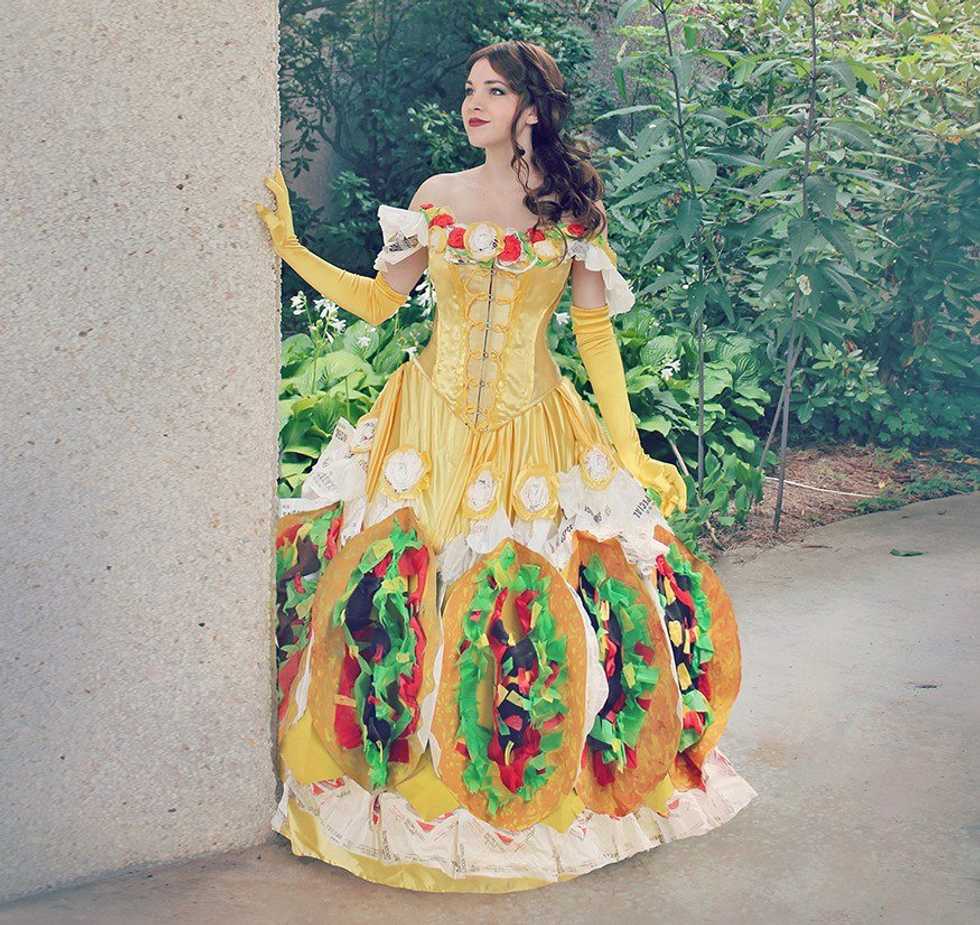 8. Taco Bell(e) - To be honest, this costume is plain awesome. Either purchase a Princess Belle costume or wear a yellow dress with a crown, and add anything taco related. Some options are to tape pictures of tacos to yourself, walk around with a case clearly marked saying tacos, or create a poster or sign that looks like a Taco Bell product.