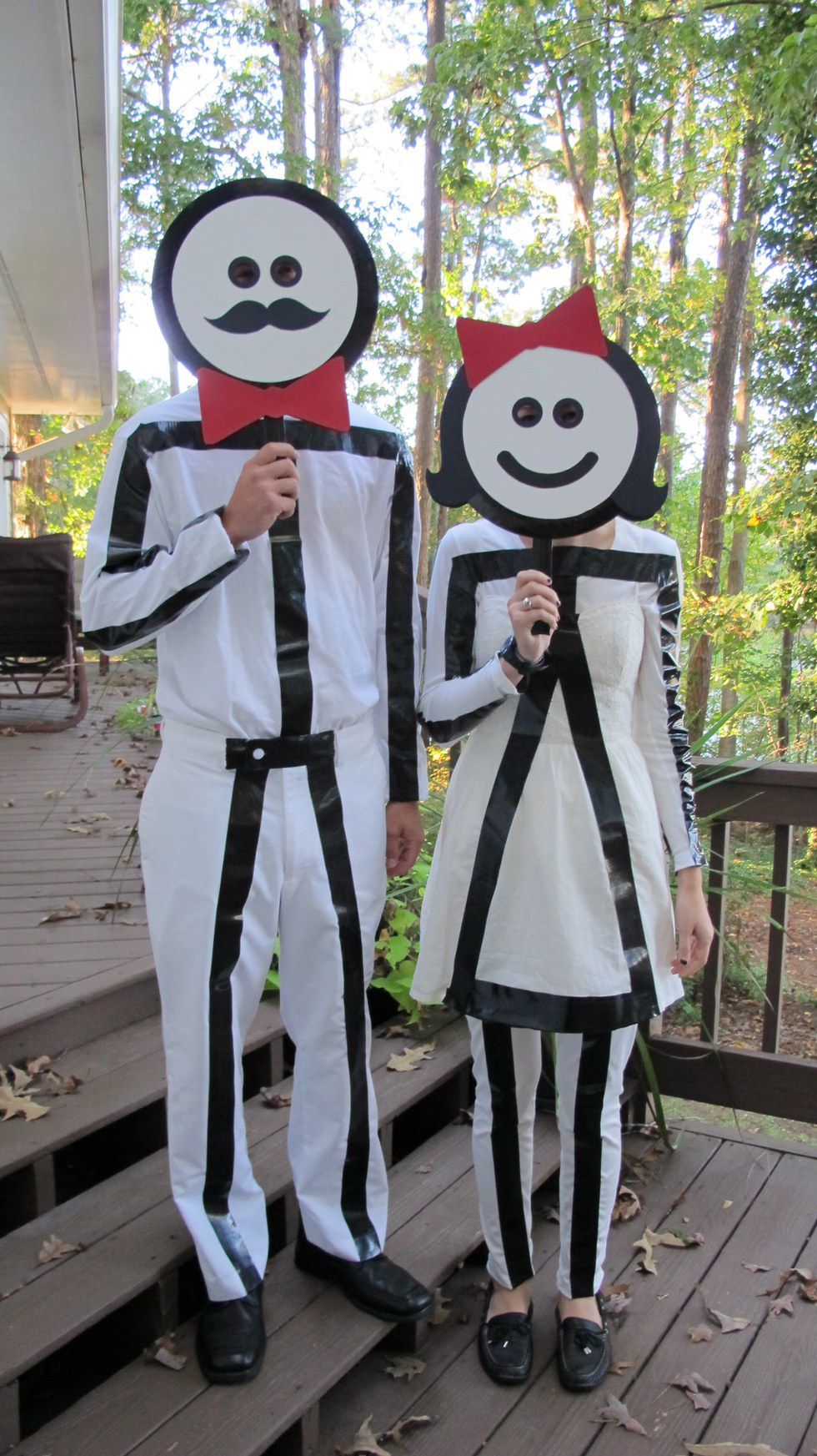 This is another one that I have seen a few different ways. Some people wear glow sticks over black clothes, but unless you are somewhere really dark, that isn't as cool, so I picked this alternative. White clothes with black duct tape. You could use a white poster board and sharpie for the faces, and the bows are optional. This one is one that would be really fun in a big group.