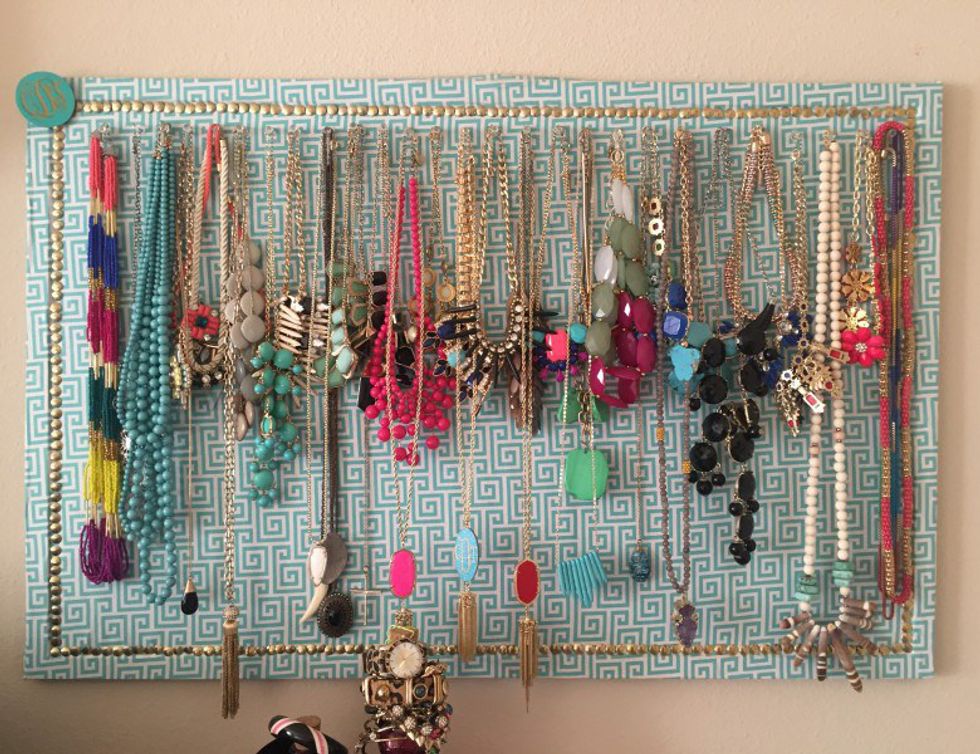 This jewelry organizer in the picture above looks pretty fancy, but you could make yours simple. I personally would just use a cork board, paint it with acrylic paint or cover it in some fabric, and then add some pins to hold jewelry. There's no need for a border or anything like that, unless you want to make it fancy.