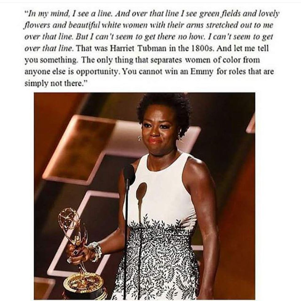 In her Emmy acceptance speech Davis spoke out about the issues unique to women of color. She highlights the intersectional prejudice that comes with falling on the oppressed side of multiple social dichotomies. By using a quote from Harriet Tubman Davis illustrates that, although we have made progress, we still have a long way to go.