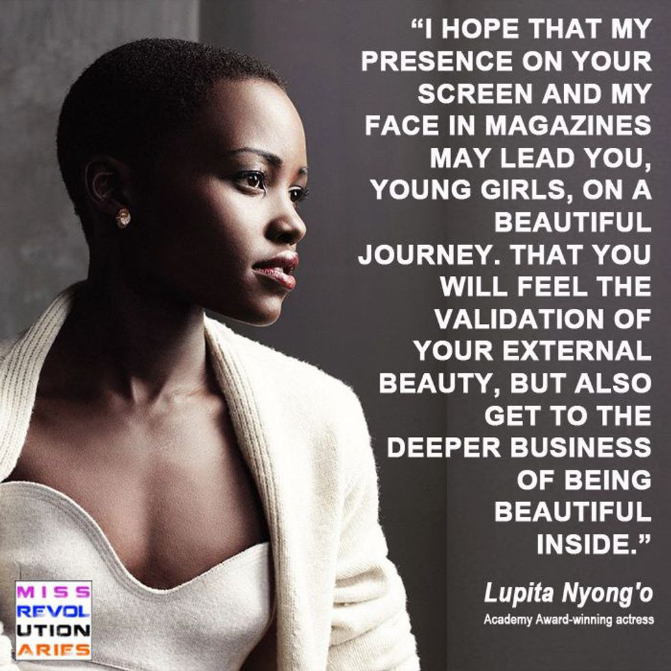Oscar-winning Nyong'o spoke up about the unrealistic beauty standards that young girls are often faced with. She recounted her own struggles with her dark skin and African-Mexican heritage. In 2014 People named her "The Most Beautiful Woman." However, in the quote below, she encourages girls to seek internal beauty first and to love themselves just as they are.