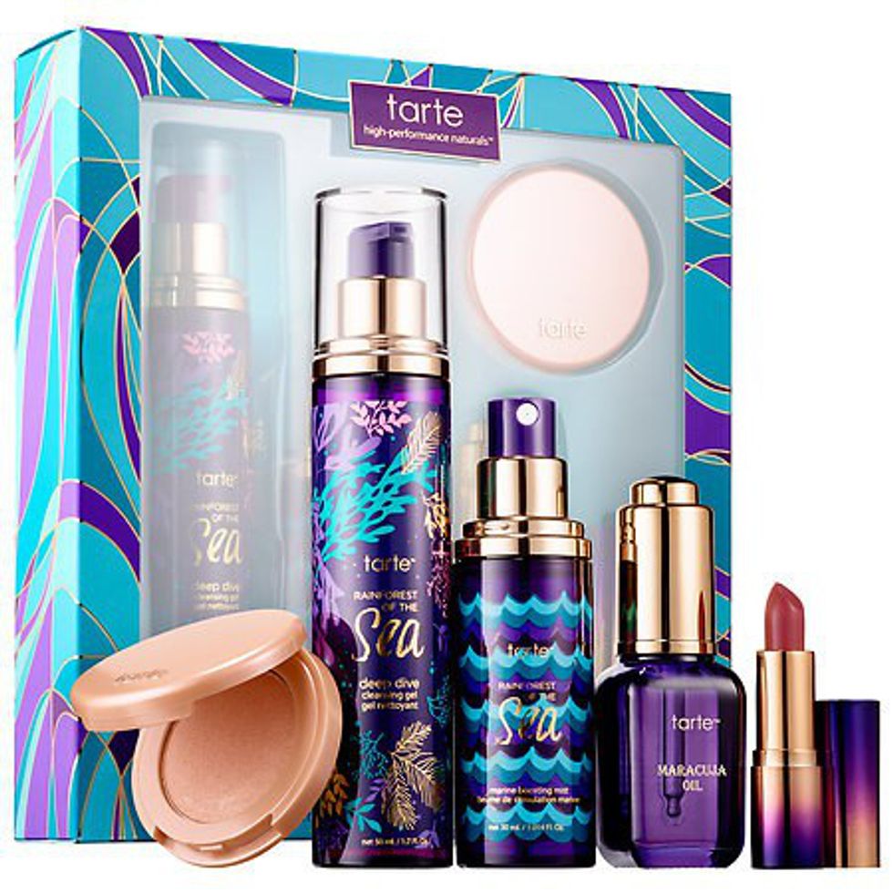 This kit is perfect for the makeup lover on the go who wants to remain refreshed and fabulous. It includes the Sea Deep Dive Cleansing Gel, Rainforest of the Sea Marine Boosting Mist, Rainforest of the Sea Drench Lip Splash Lipstick, Maracuja Oil, and Amazonian Clay highlighter. Keep your skin glowing while still looking natural. The best part? Tarte is vegan-friendly and cruelty free!