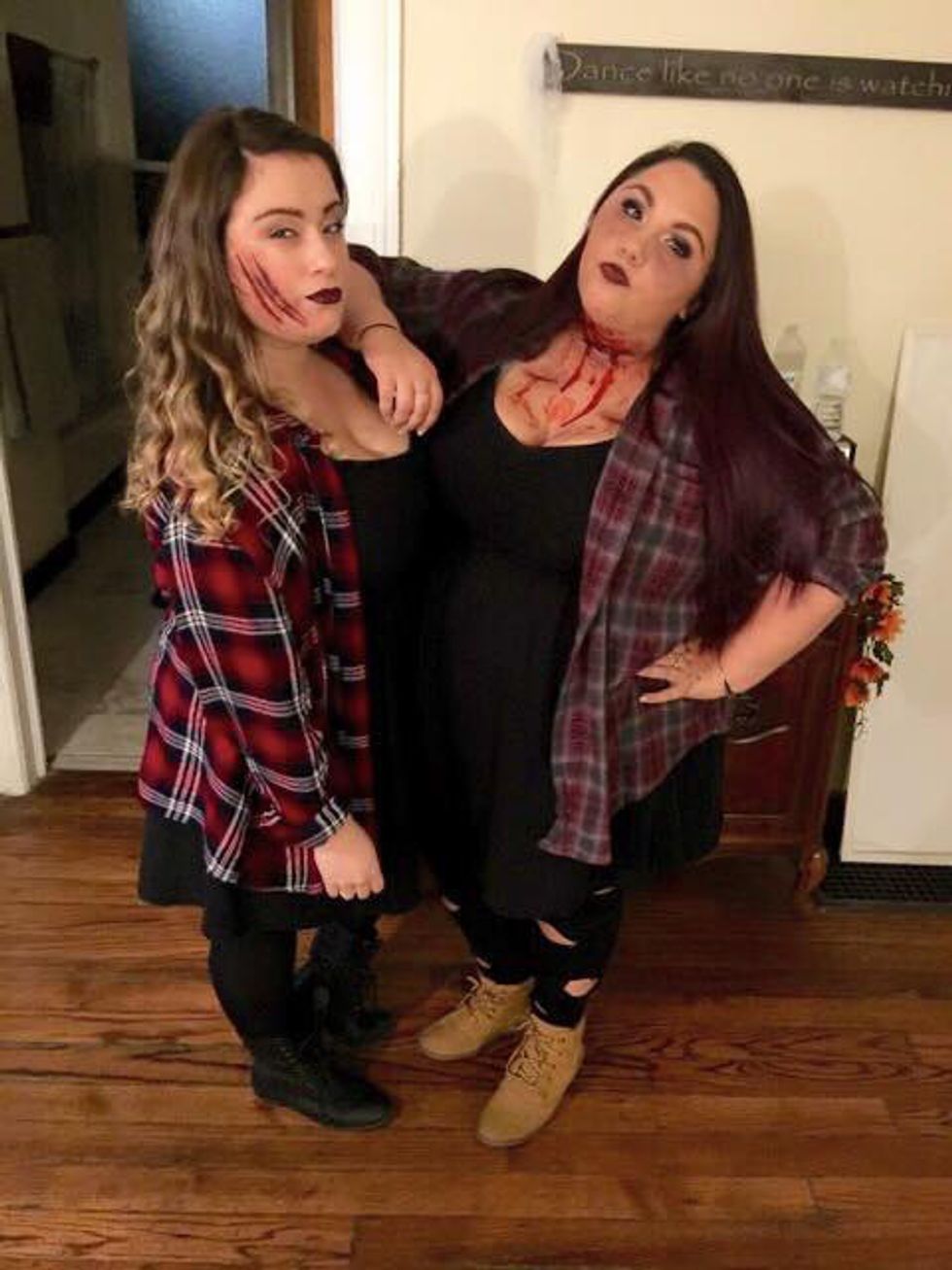 When we inevitably ran out of ideas for the entire weekend of Halloween and had used up most of our allotted budget on creative costumes we went to an old classic and ended up being pleasantly surprised with the results and the compliments we received! We found temporary "bloody" tattoos at Dollar General and Fake Blood at Walmart. We dressed up in clothes we felt cute in (and decided to match) and not only did we feel cute but we also looked scary! A lot of people complimented the work and we were amazed that such a cheap, simple costume could look so good! We had the benefit of someone with special effects makeup knowledge but even without it, the tattoos and fake blood looked really good!