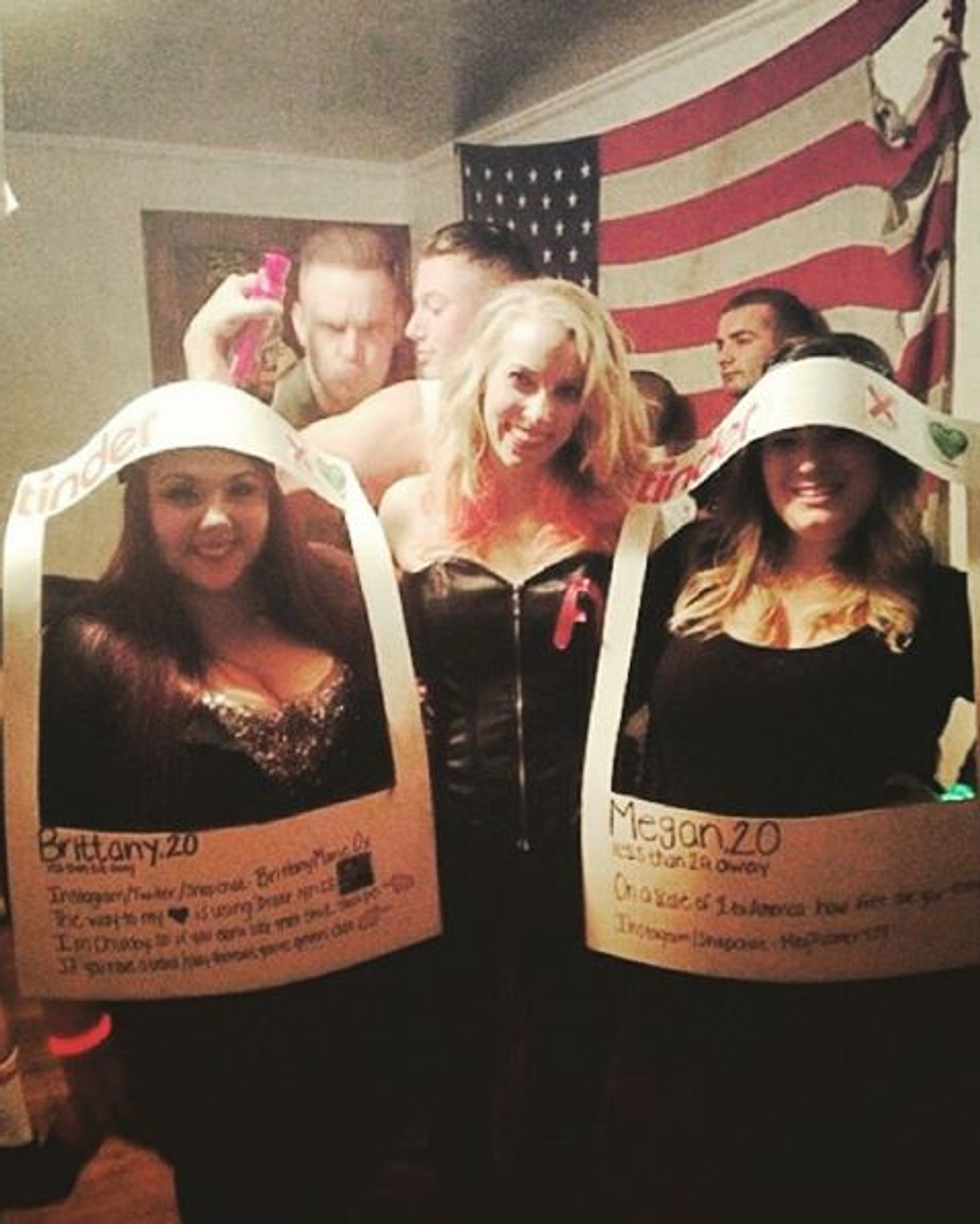 This one is just common sense as to why it was so loved. This costume was a HUGE hit and got a ton of compliments throughout the night. This was inexpensive but definitely required some extra effort on our part. We bought the paper at Walmart and created the tinder "profile" then found the best solution to be stapling the paper to a bandana that we tied around our heads. This gave us the freedom to use both our hands and the paper could bend enough to get through crowds at parties and bars without completely destroying the costume. I definitely recommend this costume because it was SO much fun.